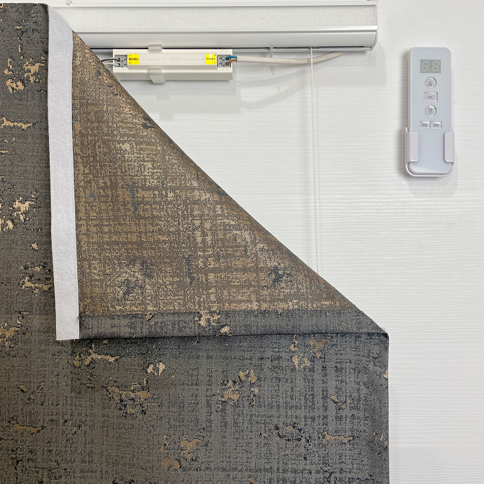 Карниз с электродвигателем и блоком питания, который подключается к сети переменного тока 220В. Надежный мотор, производства компании A-OK, расположен внутри стандартного карниза для римской шторы. Компактный блок питания на специальном кронштейне размещается под профилем карниза с любой, удобной для подключения стороны.