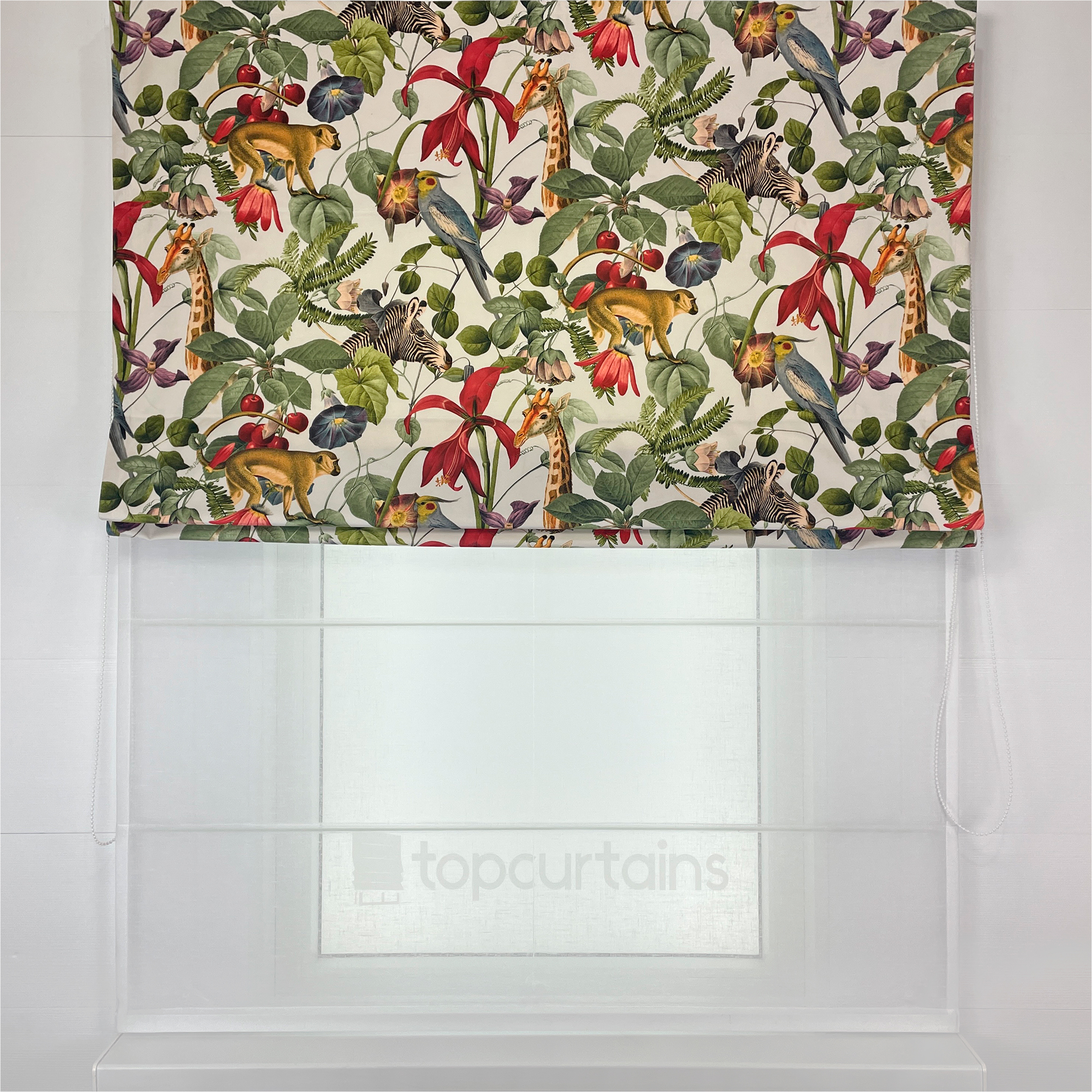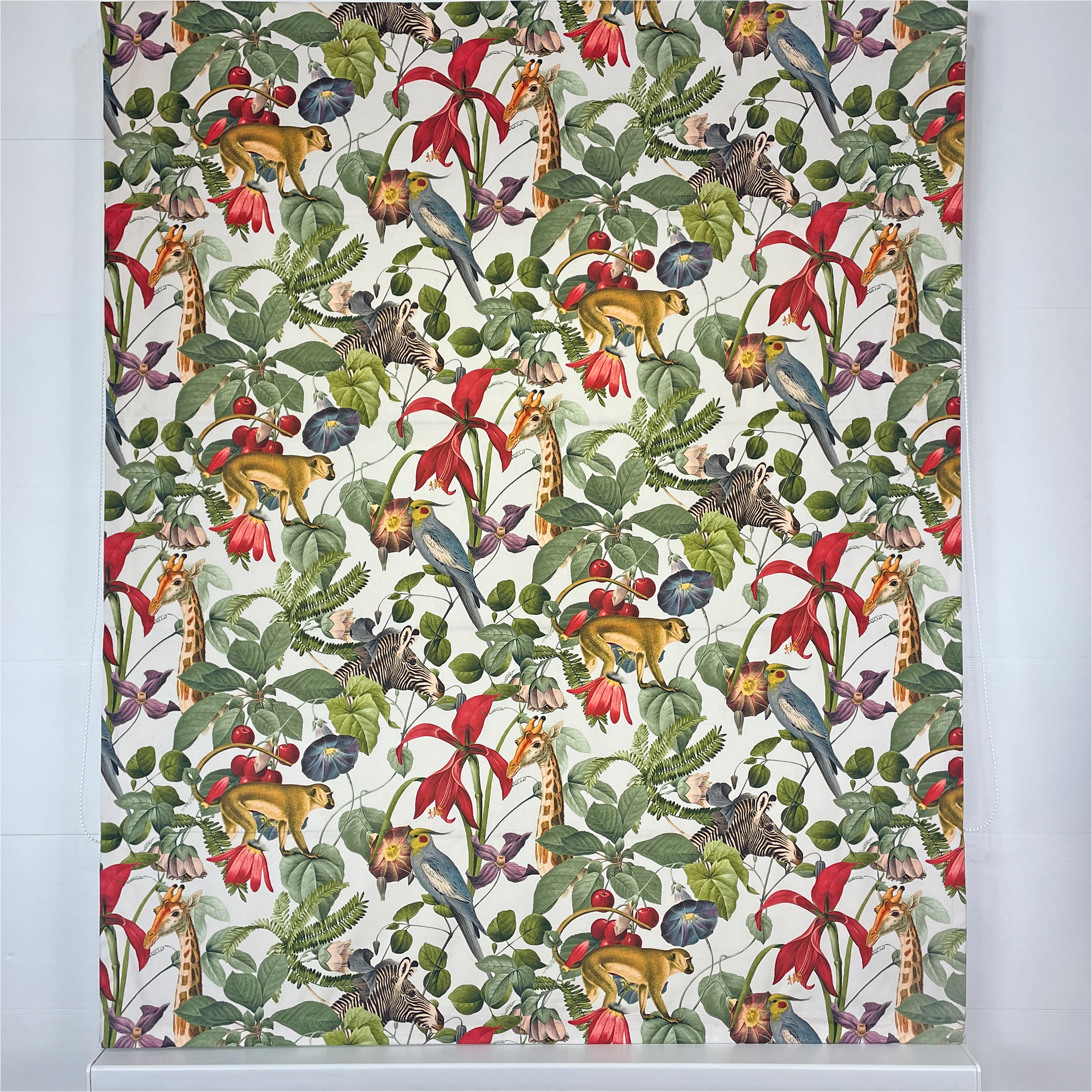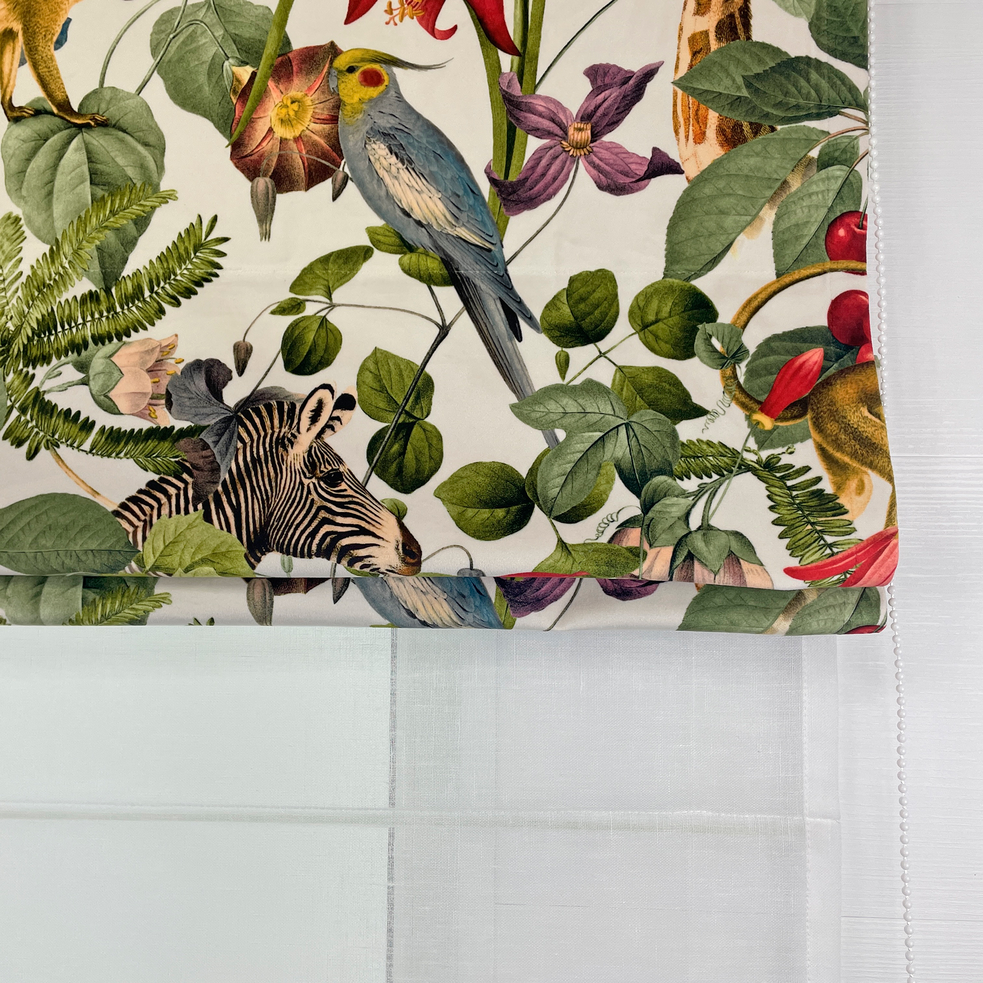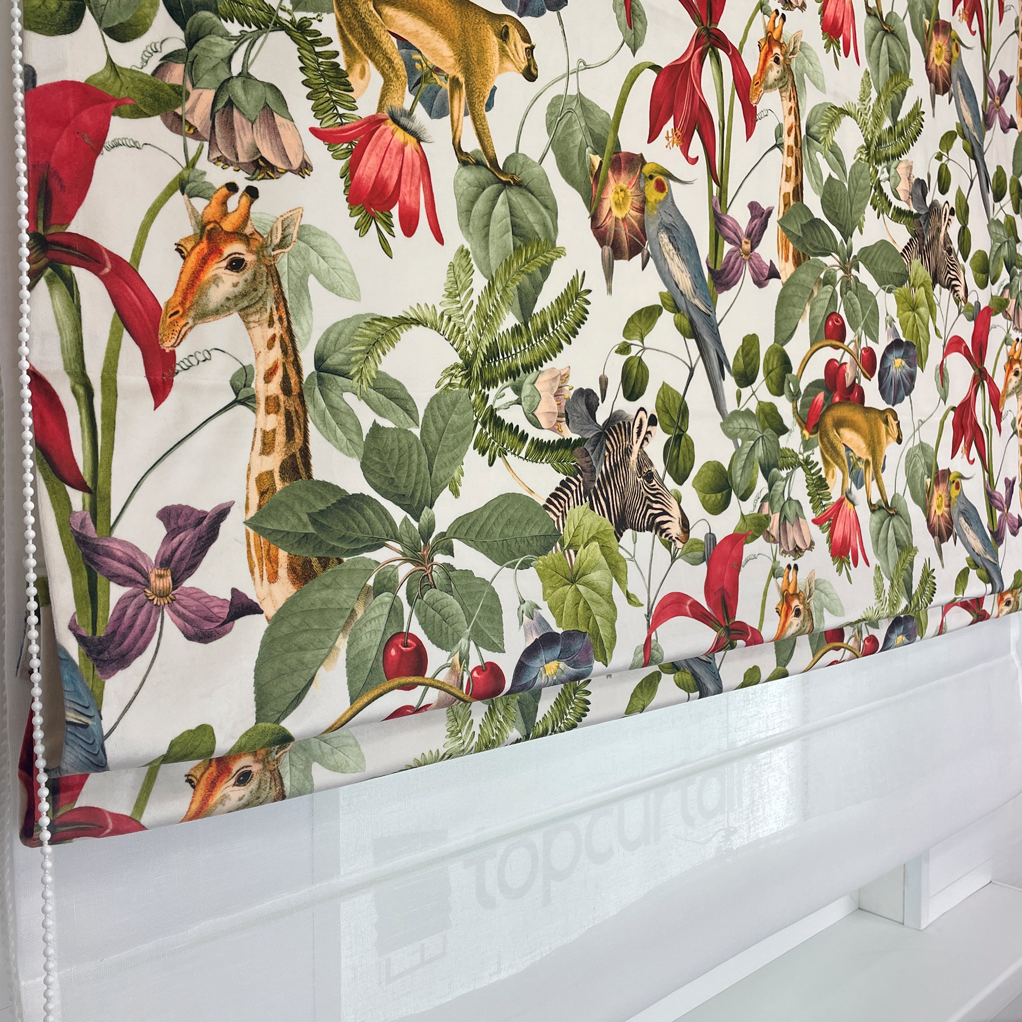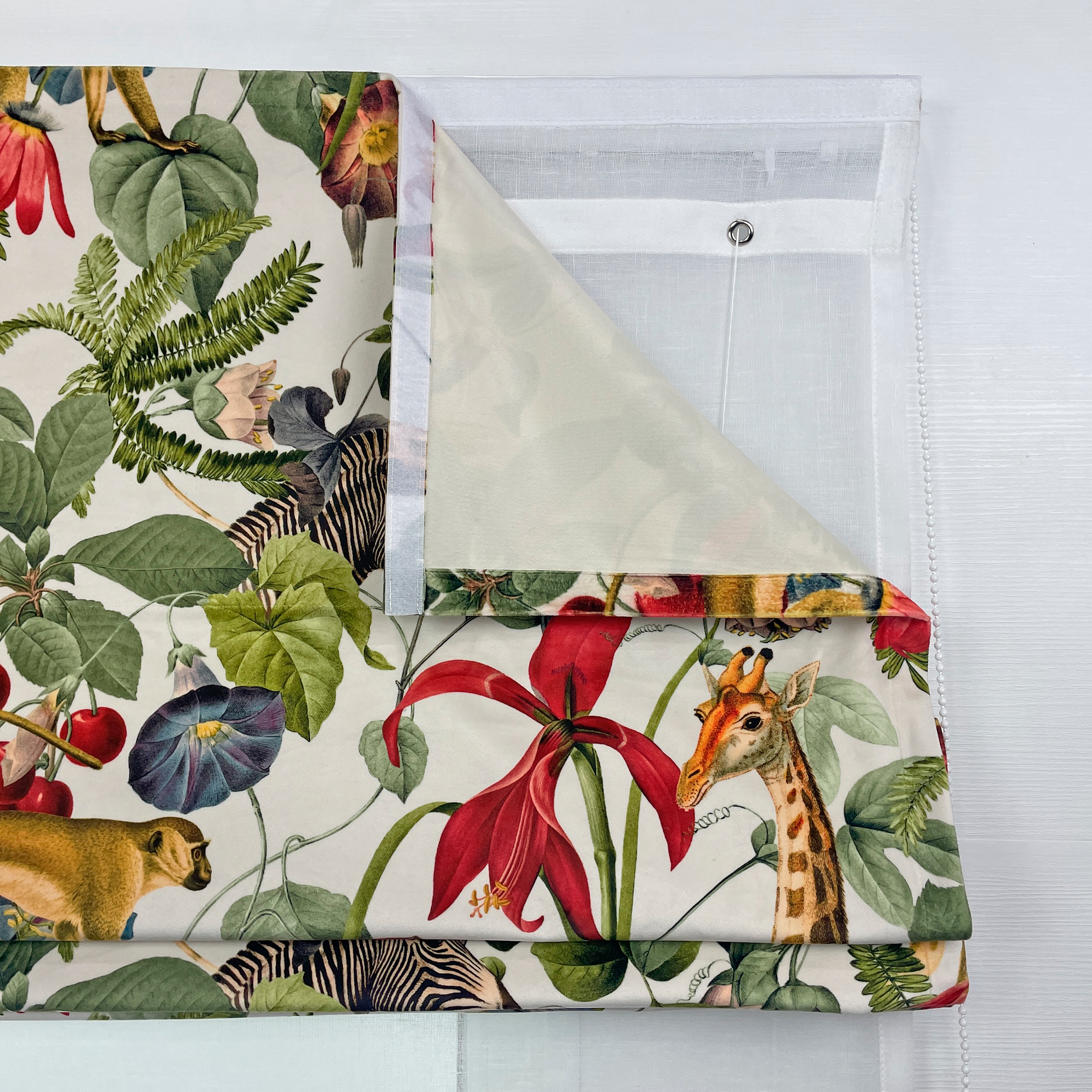Двойная римская штора с ярким принтом с изображением животных и цветов на бархатной основе. Бархатная фактура материала добавляет рисунку объема, делает его живым и переливающимся при дневном свете. Штора достаточно плотная и хорошо защищает от прямых солнечных лучей. При желании вы также можете заказать эту штору с подкладом блэкаут.