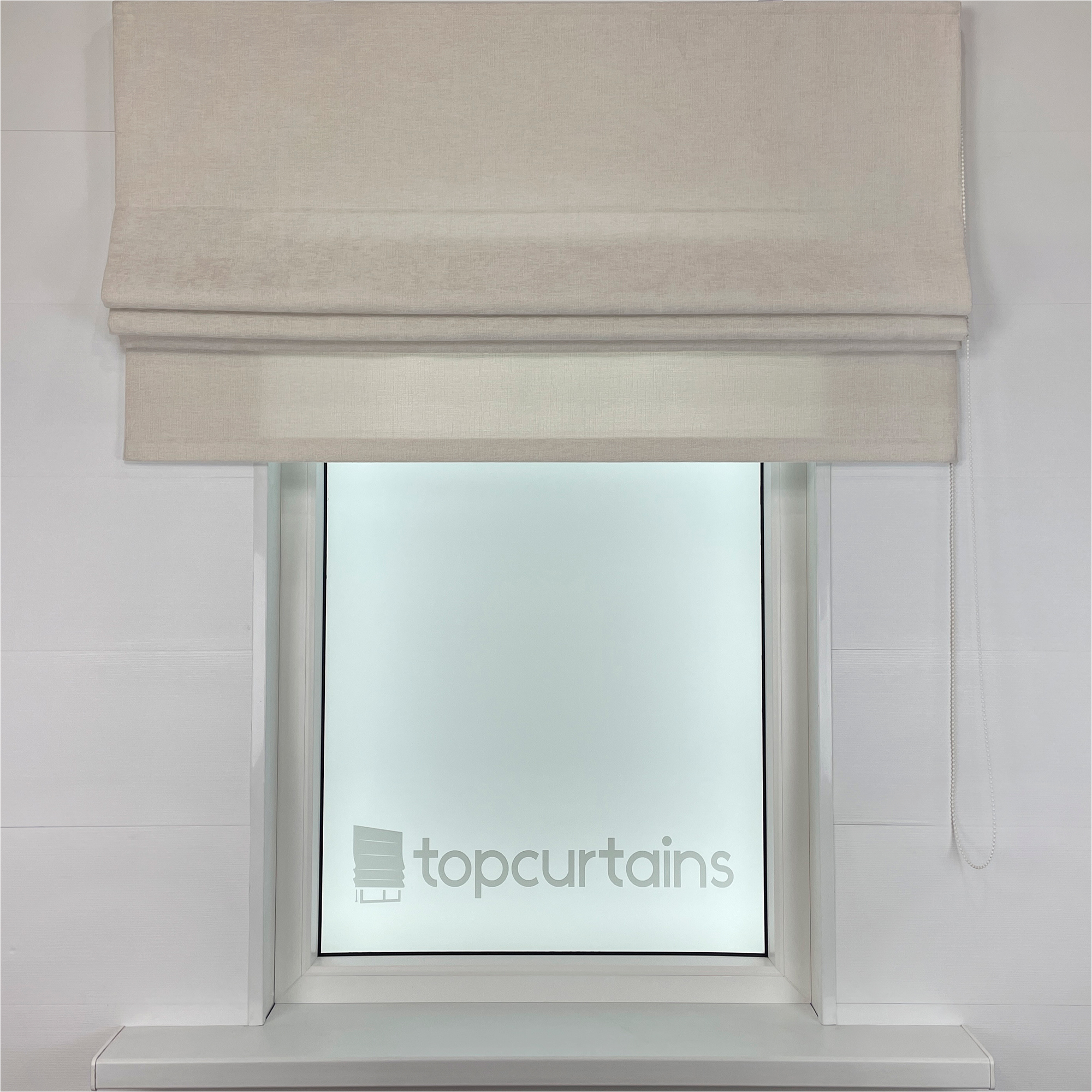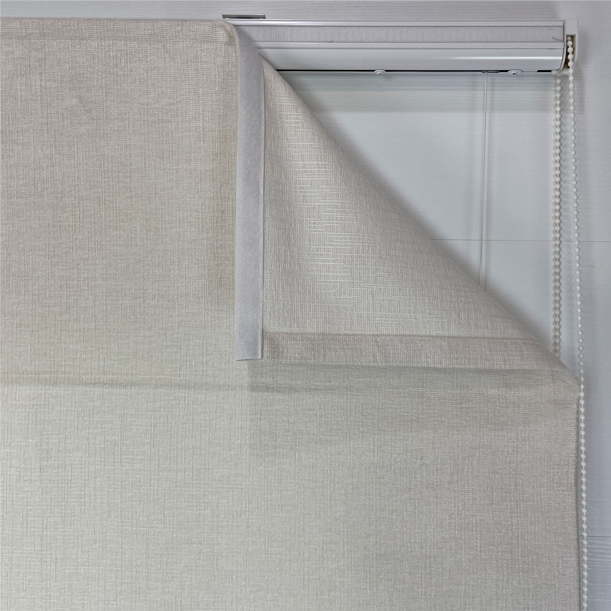 Полотно римской шторы изготовлено из мягкого, ворсистого шенилла молочного цвета. За счет своей фактуры шенилл дает очень глубокий, сложный цвет, который переливается и играет различными оттенками, придавая шторе неповторимый шарм.