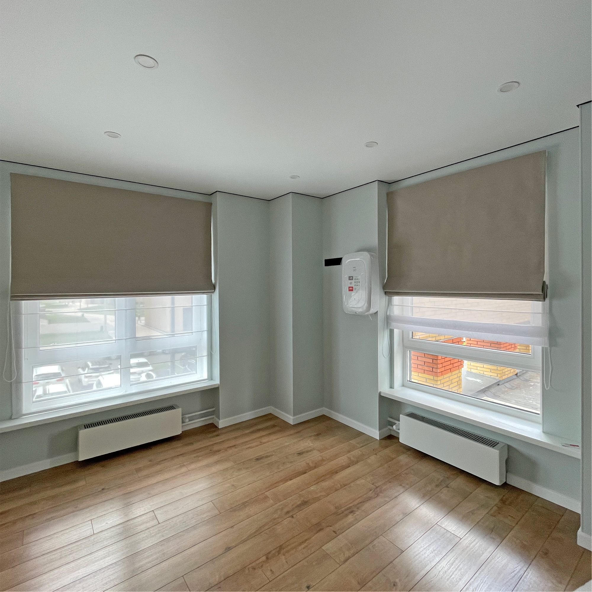 Если у вас широкий проем в котором вы хотите разместить несколько римских штор, то в этом случае суммарная ширина должна быть на 1 см меньше ширины проема, предусматривать зазор между шторами не требуется.
