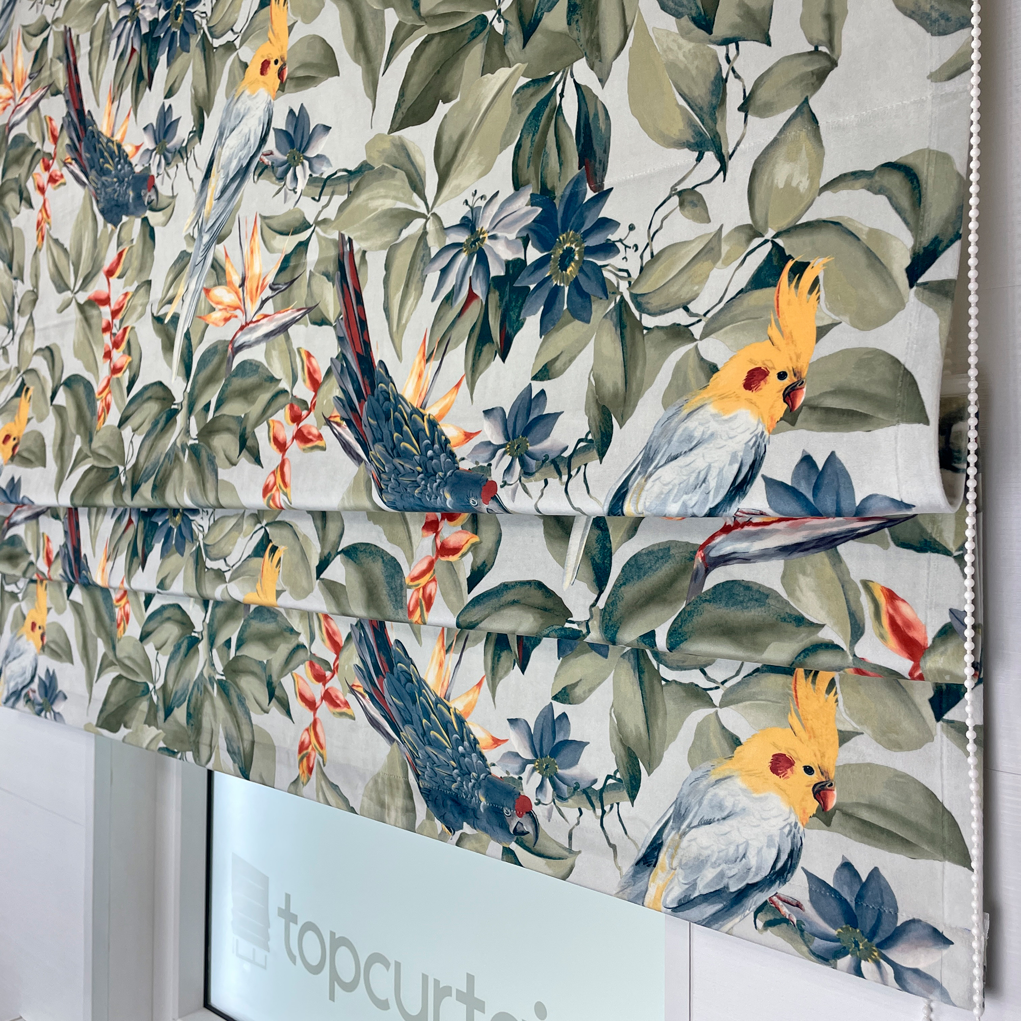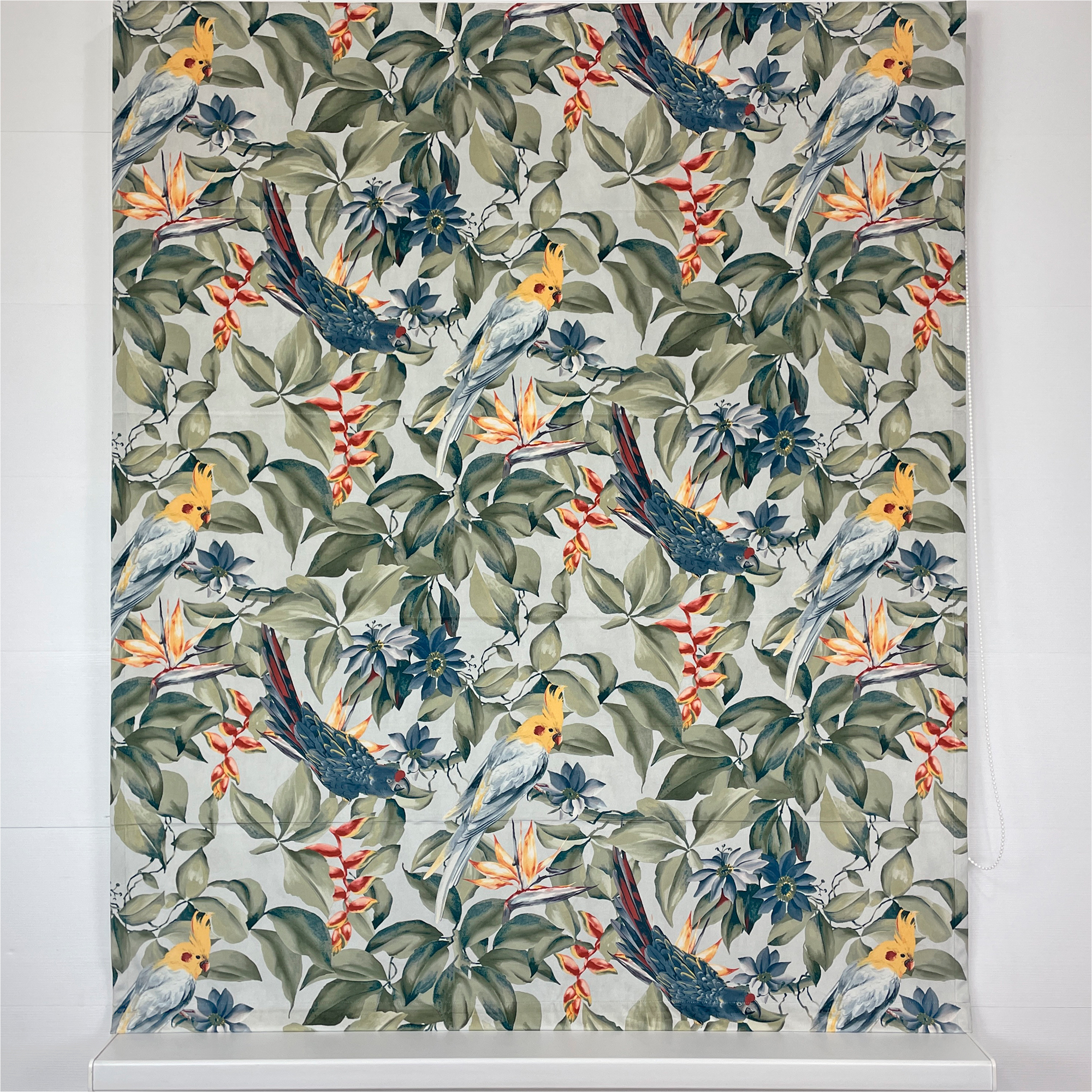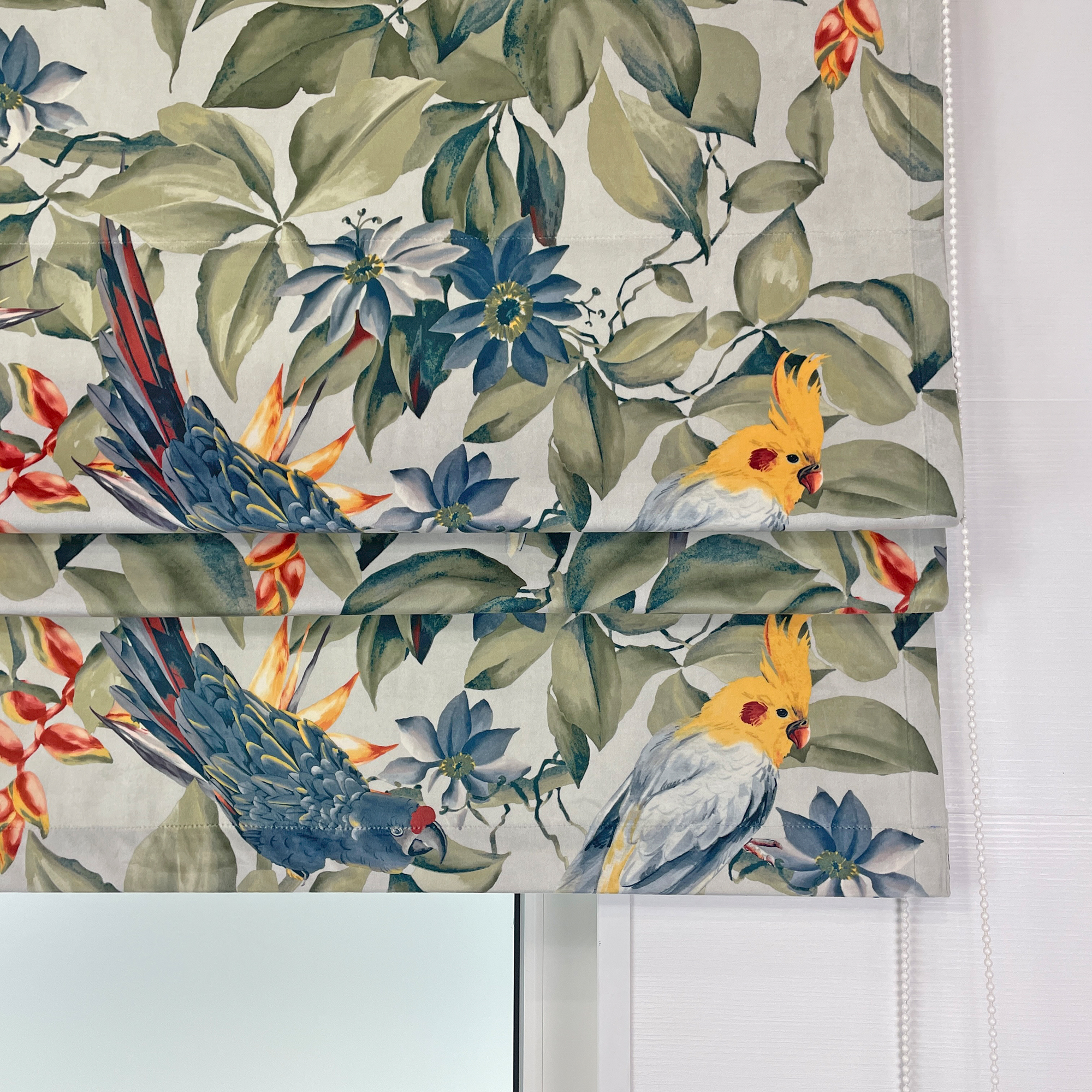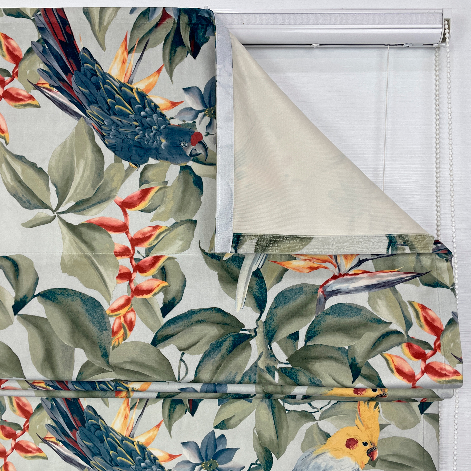 Римская штора с ярким принтом с изображением попугаев. Бархатная фактура материала добавляет рисунку объема, делает его живым и переливающимся при дневном свете. Штора достаточно плотная и хорошо защищает от прямых солнечных лучей. При желании вы также можете заказать эту штору с подкладом блэкаут.