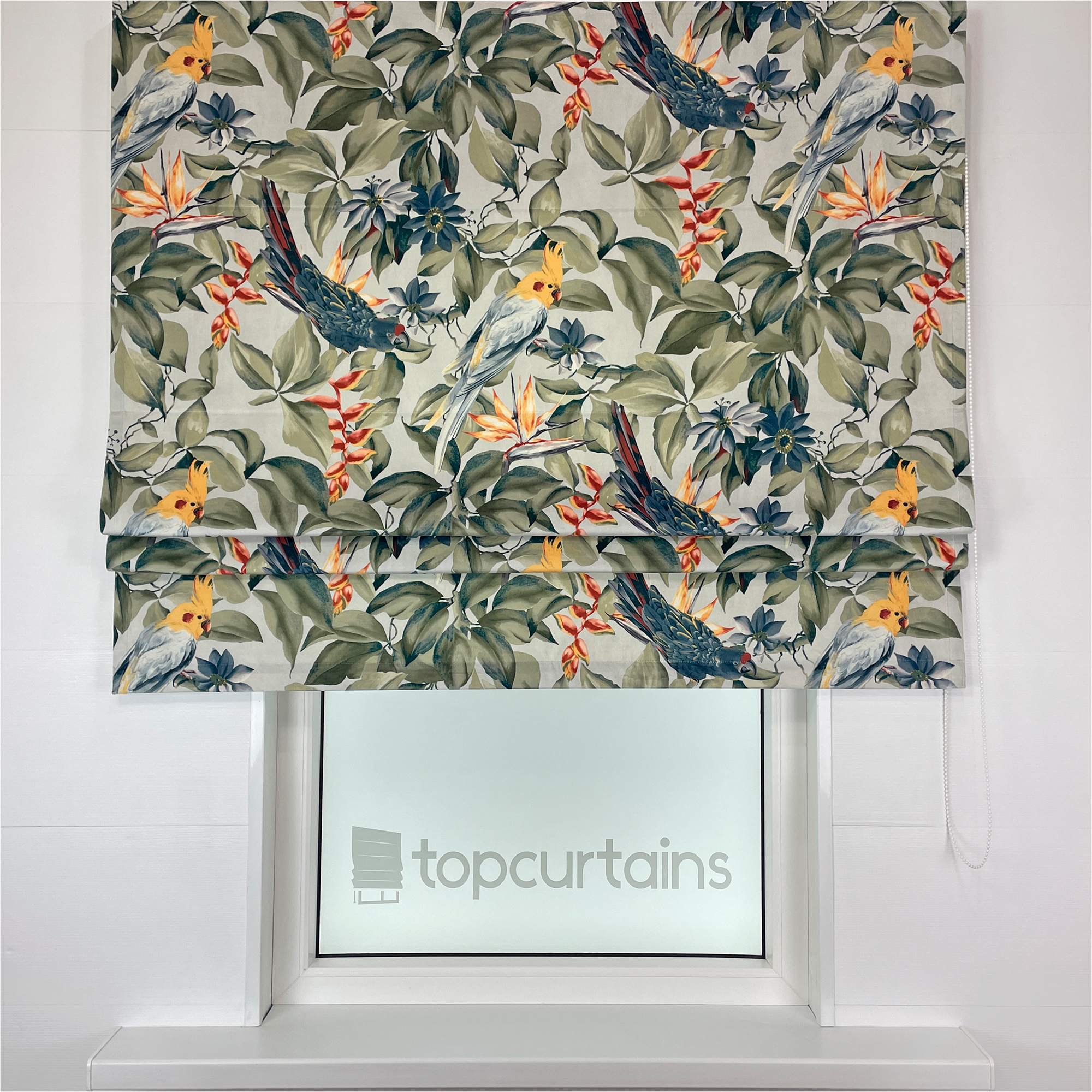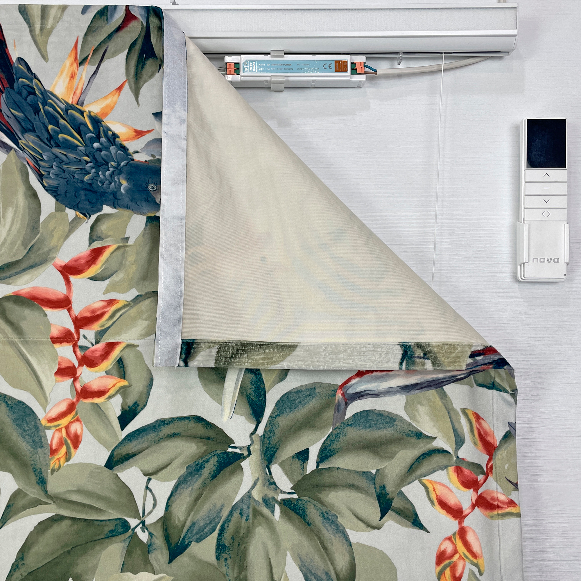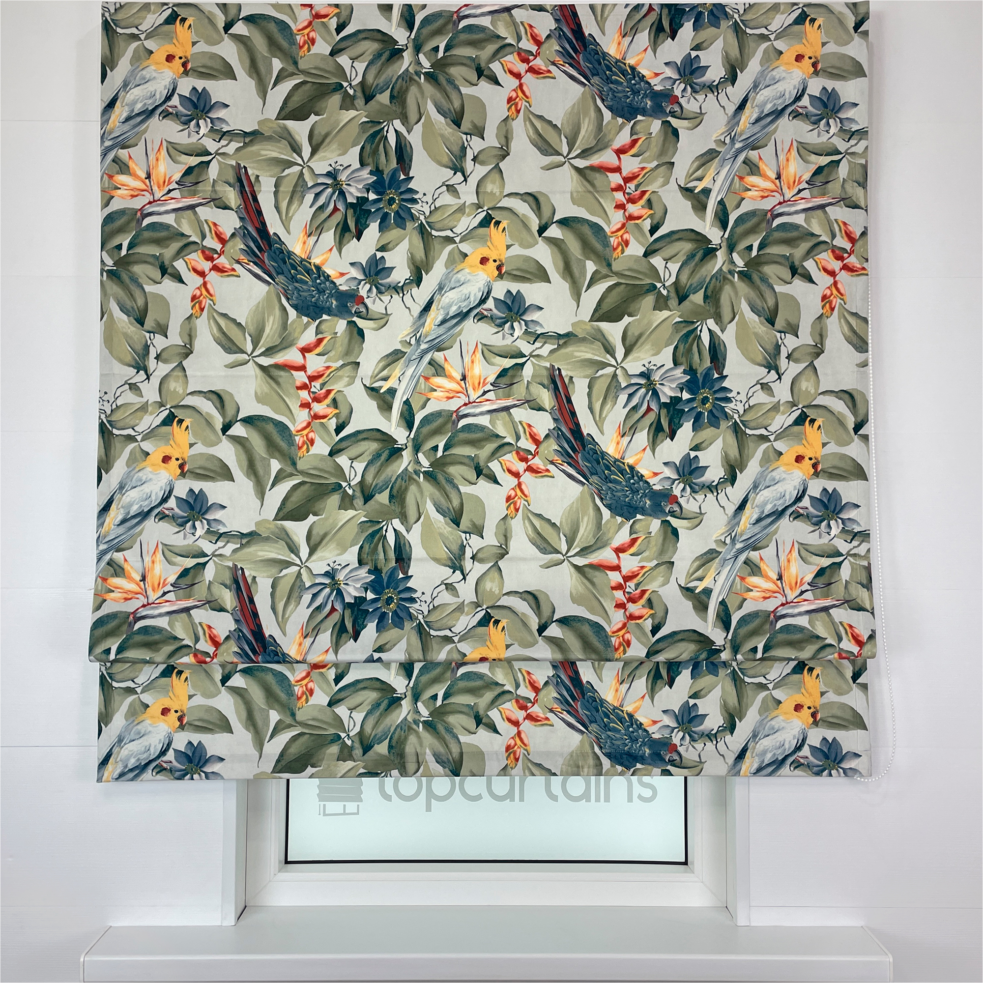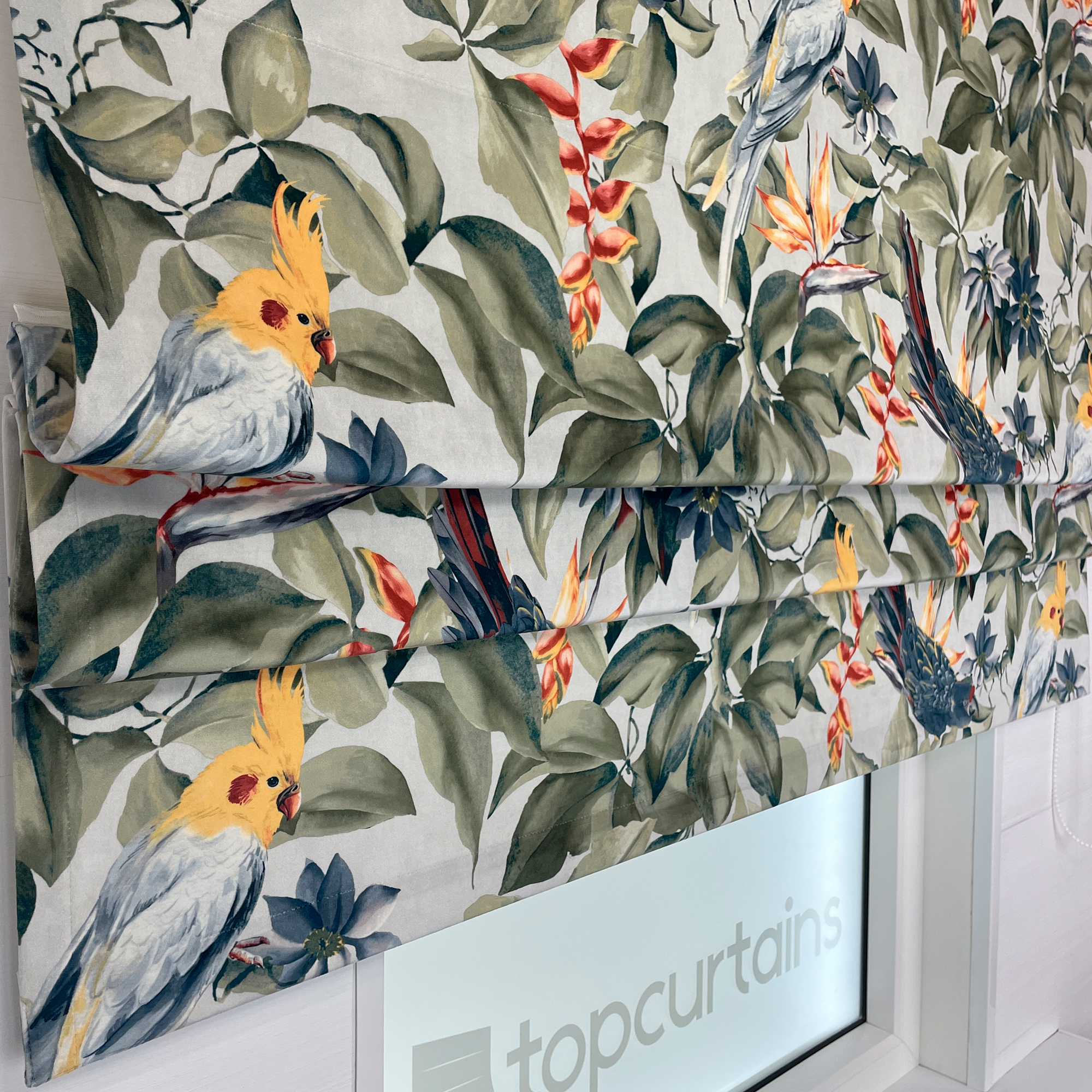 Римская штора с ярким принтом с изображением попугаев. Бархатная фактура материала добавляет рисунку объема, делает его живым и переливающимся при дневном свете. Штора достаточно плотная и хорошо защищает от прямых солнечных лучей. При желании вы также можете заказать эту штору с подкладом блэкаут.