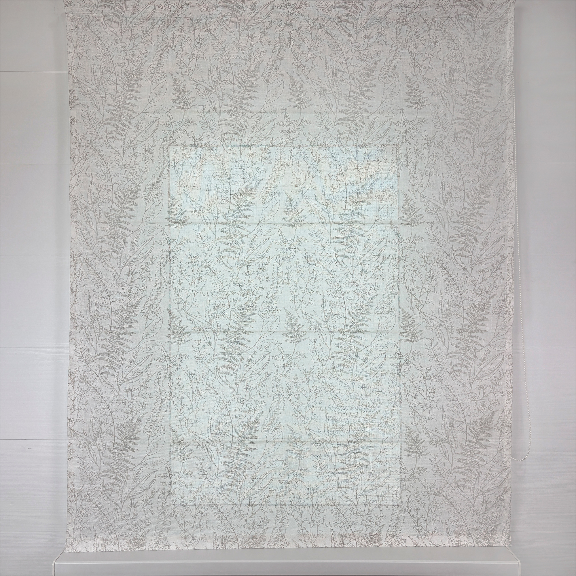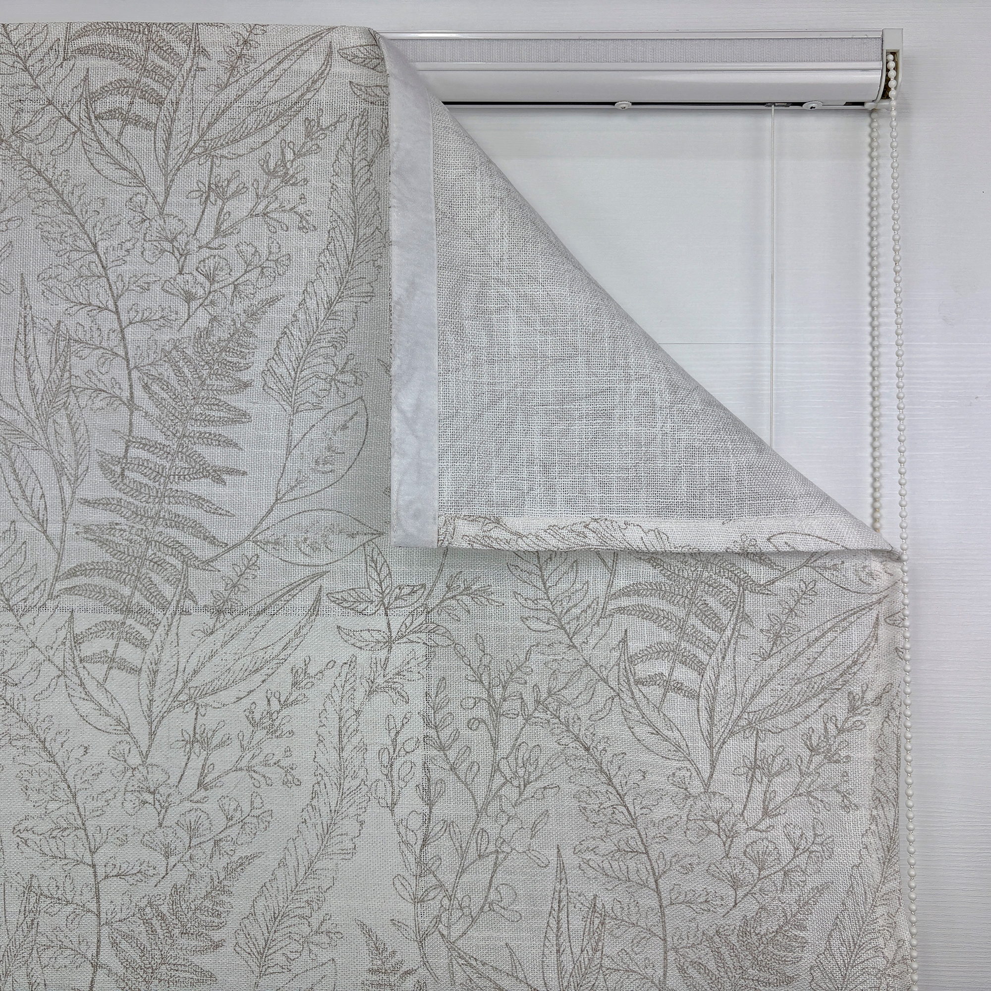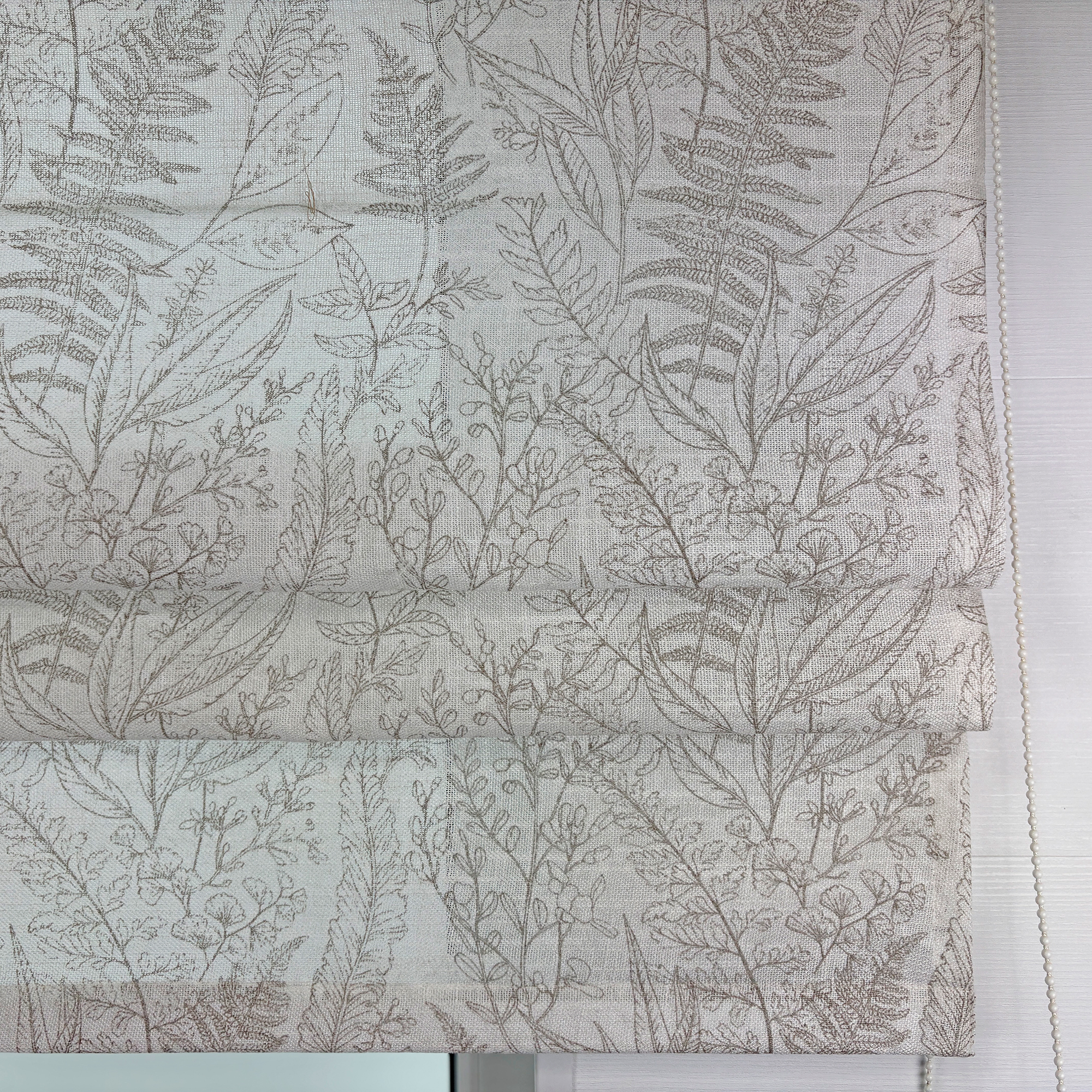Римская штора из плотного, полупрозрачного тюля с фактурой хлопка. Тань украшена растительным орнаментом в стиле ботанической иллюстрации.