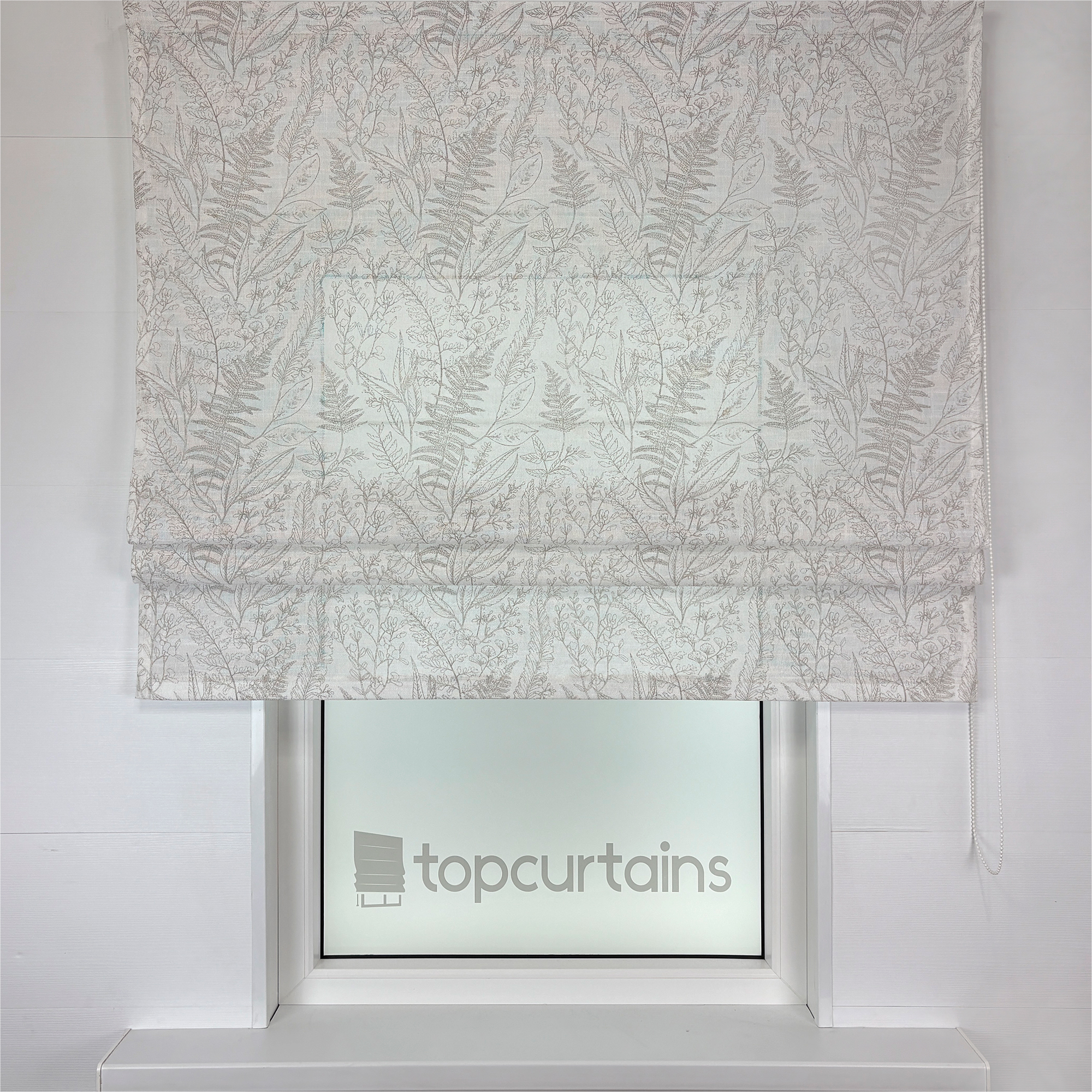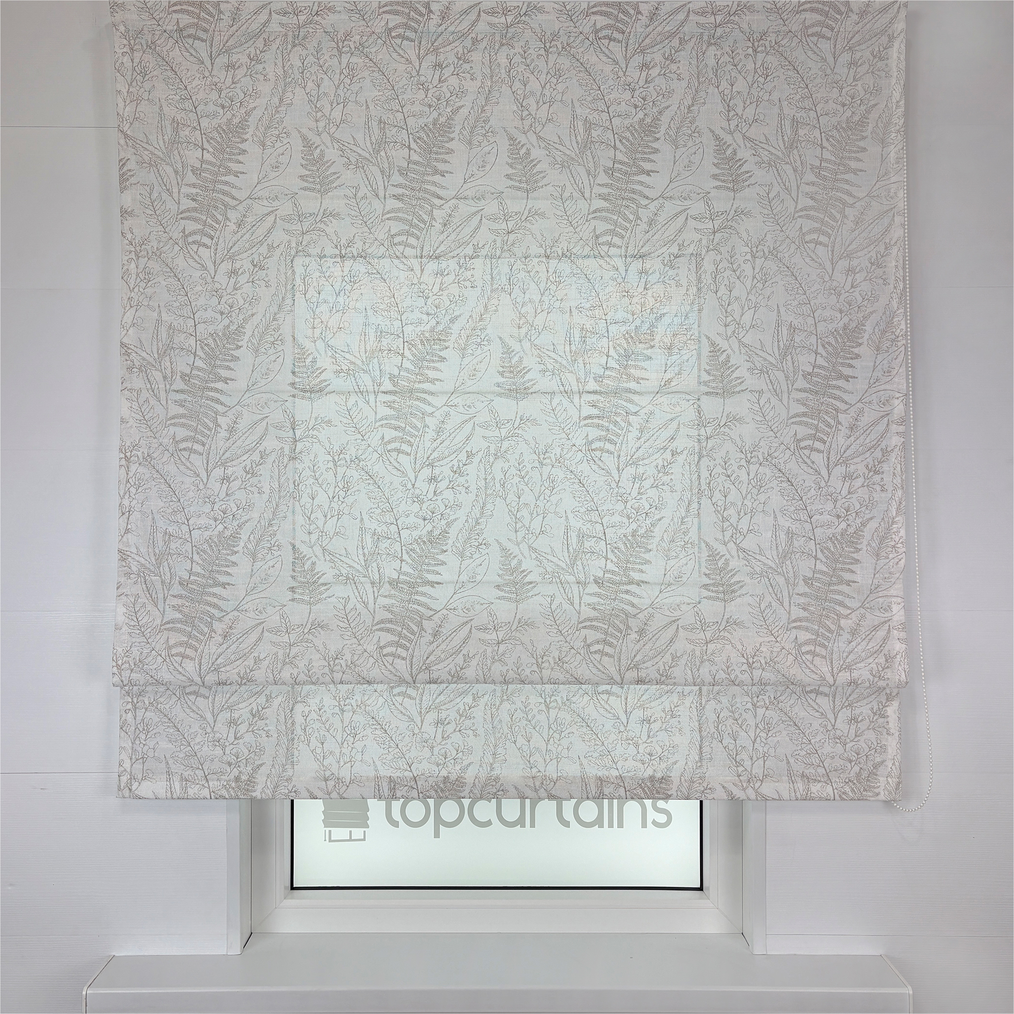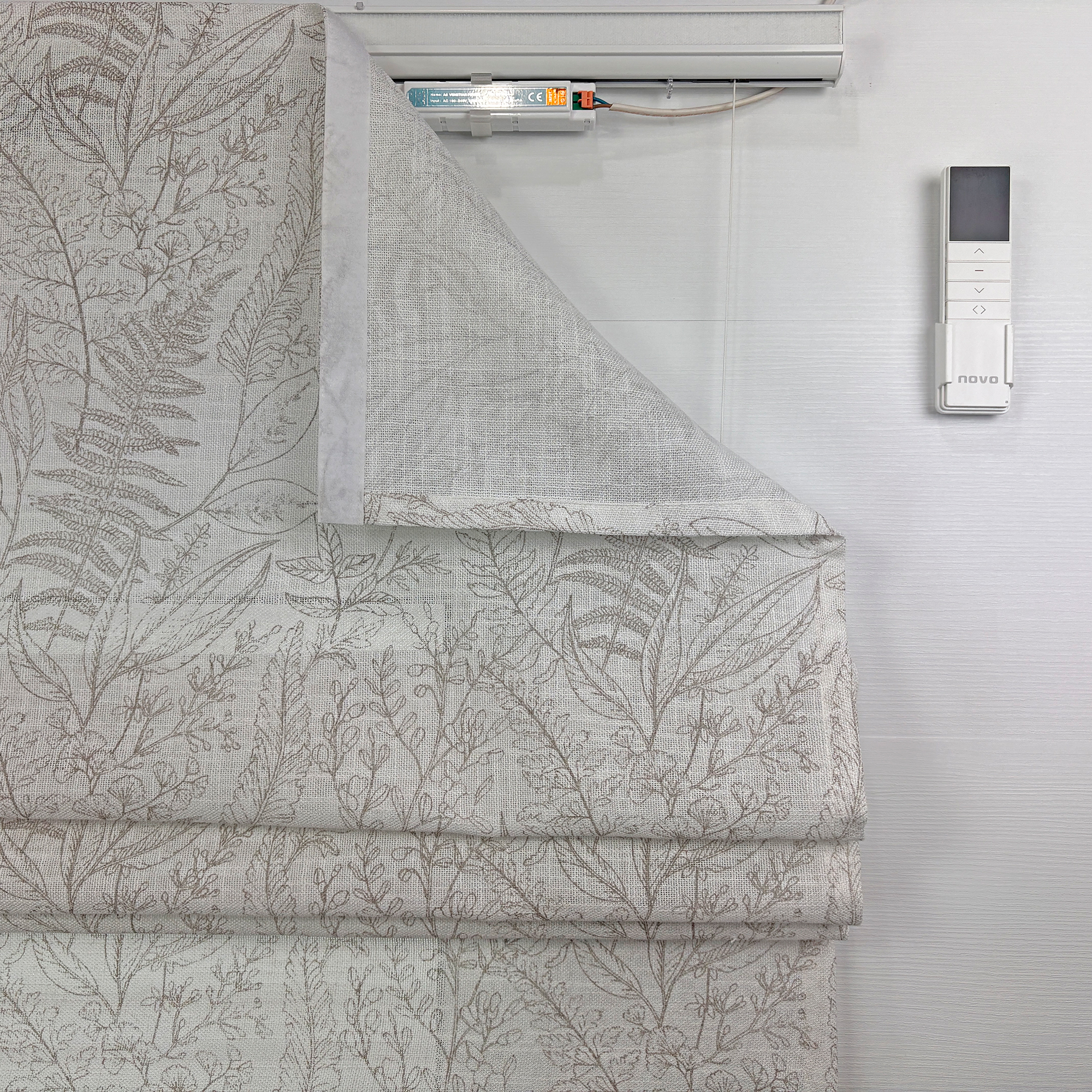 Римская штора из плотного, полупрозрачного тюля с фактурой хлопка. Тань украшена растительным орнаментом в стиле ботанической иллюстрации.